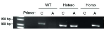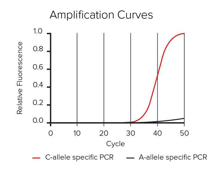 以1 ng/μl的HeLa細(xì)胞gDNA為模板,基于染料法進(jìn)行等位基因特異性PCR,結(jié)果顯示只有C等位基因特異性引物被擴(kuò)增,在50個(gè)擴(kuò)增循環(huán)后,A等位基因特異性引物依然沒(méi)有被擴(kuò)增。