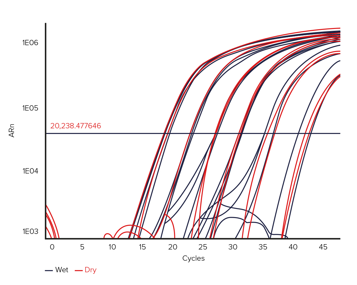 紅色:經(jīng)凍干處理后復(fù)溶的MedixMDx qRT-PCR Lyo ready mix