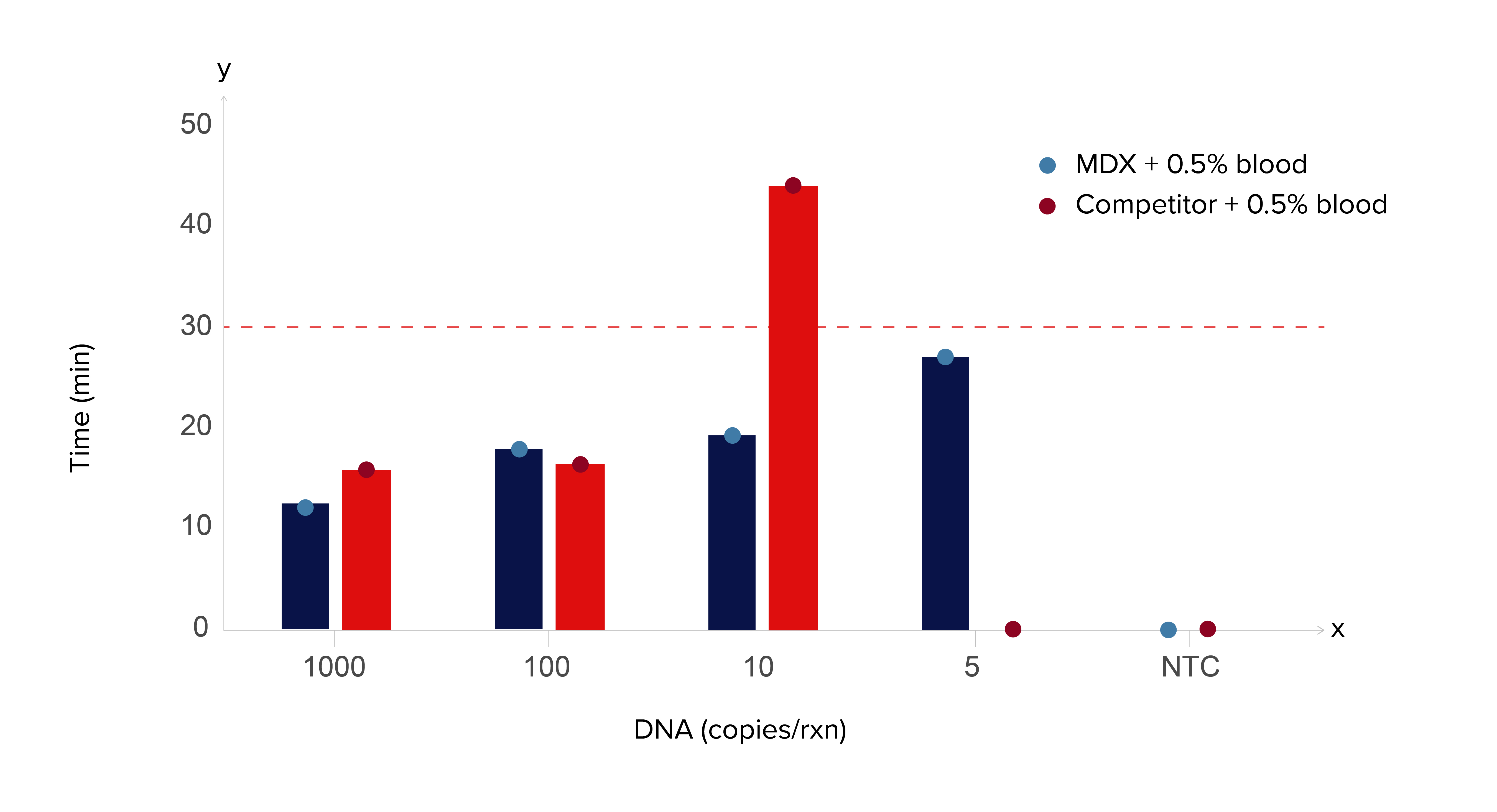 lambda DNA梯度稀釋作為模板進(jìn)行等溫?cái)U(kuò)增,使用MedixMDx Fast Bst Mix與另一供應(yīng)商同類產(chǎn)品進(jìn)行對(duì)比實(shí)驗(yàn),并加入0.5%人血進(jìn)行抑制耐受試驗(yàn)。