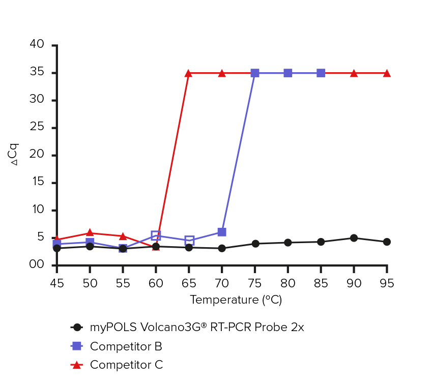 Volcano3G? RT-PCR Probe Mastermix在高達(dá)95°C的溫度范圍內(nèi)都能保持活性,而其他供應(yīng)商的同類產(chǎn)品在60°C和70°C時(shí)即失去活性。