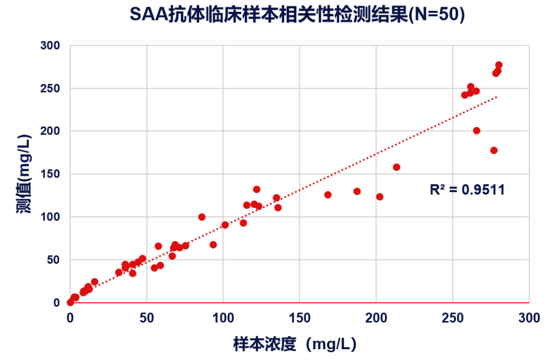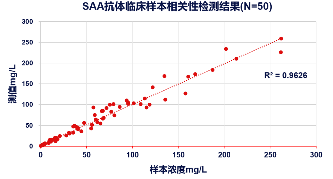 圖一:SAA抗體應(yīng)用于熒光層析平臺(tái),線性范圍5-200mg/L,同參比試劑相關(guān)性R²>0.95。